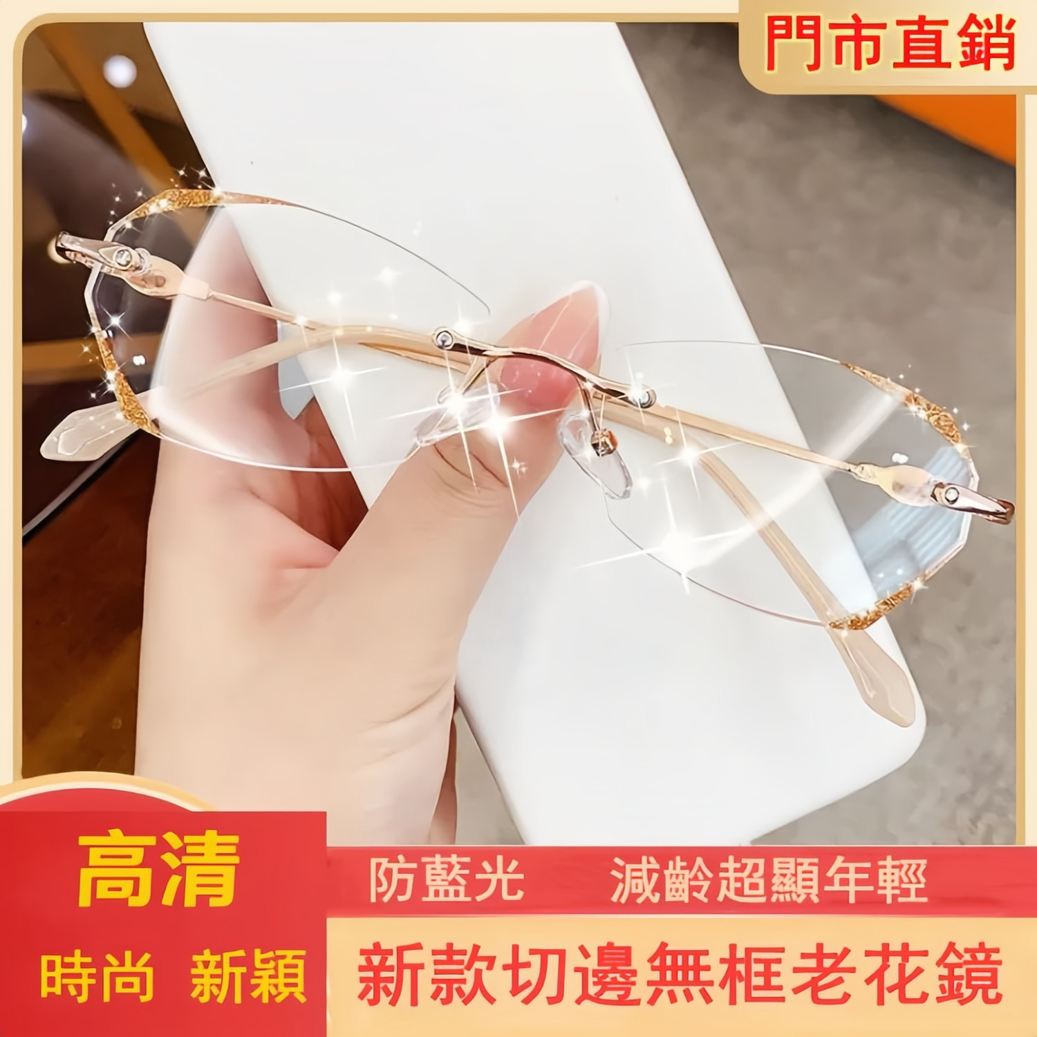 【美的不像老花鏡】無邊框眼鏡,鑽石鑲鑽切邊,防藍光,保護眼睛,防眩光,防刮耐磨!